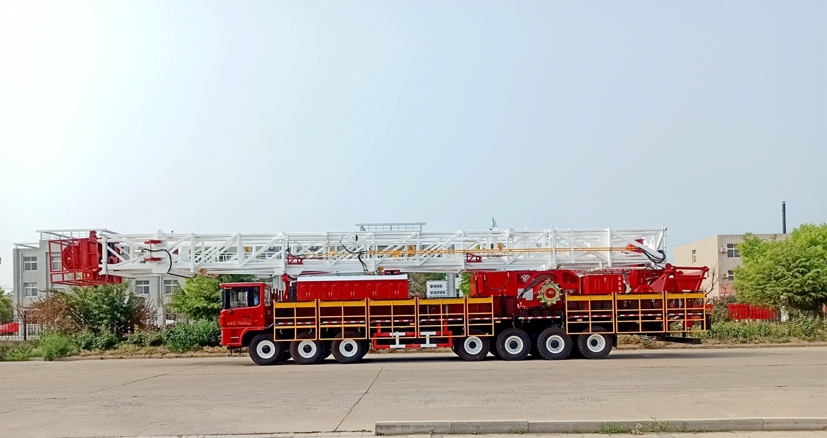 車裝鉆機(jī)是將動力系統(tǒng)、絞車、井架、游車系統(tǒng)及傳動系統(tǒng)等部件安裝于自走式底盤上。整機(jī)具有結(jié)構(gòu)緊湊,集成度高,占地面積小,移運(yùn)快捷,搬遷效率高等特點(diǎn)。